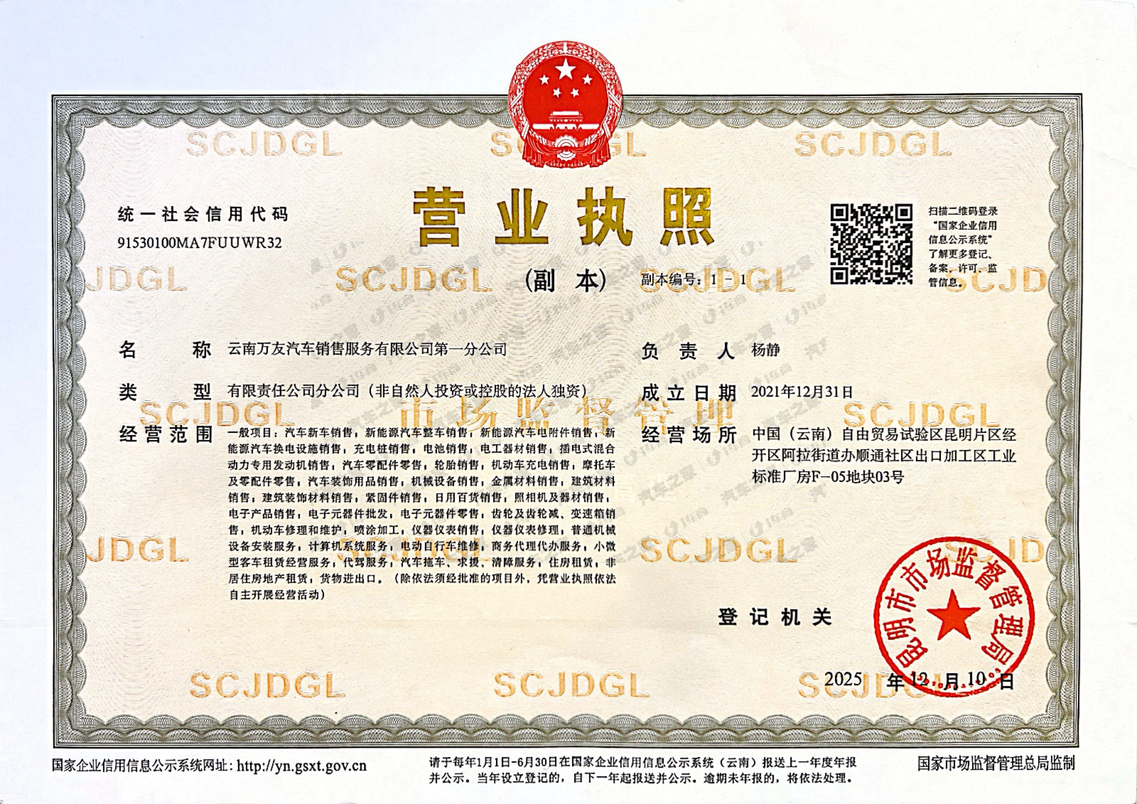云南万友汽车销售服务有限公司第一分公司,是隶属于中国兵器装备集团公司万友汽车投资有限公司的一家大型国有独资企业。 公司现拥有1000多人的员工队伍,专营长安系列汽车,年销售长安轿车逾10000辆。年维修量逾400000台。在长安汽车集团公司全国经销商中名列前茅。多次获得长安公司、云南省人民政府、中国汽车流通协会的奖励。在06年获得长安公司销售金奖、十佳优秀服务商的荣誉,同时获得云南省企事业"诚信单位"、"商品质量信誉AAA级"、"重质量,守信誉"先进单位的殊荣。07年获长安公司总销量金奖、亲情服务金奖、感动用户奖、杰出贡献奖、2014年获得中国汽车竞争力年度最佳设计SUV奖、2019-2020年度获得长安汽车金融卓越贡献经销商奖、2020年获得长安汽车全球合作伙伴大会最佳服务保障一等奖、同时获云南省诚信建设先进单位。