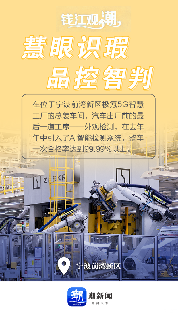 日前,在宁波前湾新区极氪5G智慧工厂的总装车间,一台台刚下线的极氪001、极氪009,进入外观检测工段。这是汽车出厂前的一道工序。以前,这个工段上的质量负责人高宏东,会戴着白手套、拿着测量工具,对全车身各细节一一触摸式检查。如今有了AI智能检测系统,高宏东的工作轻松多了。“AI比我们看得还准,合格率可以达到99.99%以上。”他得意地说。