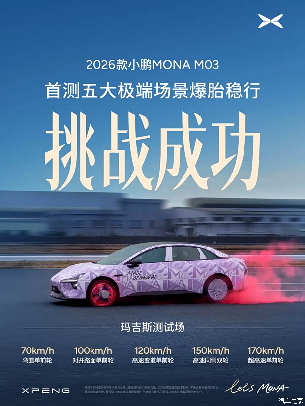 2026款小鹏MONA M03标配爆胎稳行! 五大极端场景,全部挑战成功: 70km/h弯道单前轮 ✔️ 120km/h高速变道单前轮 ✔️ 100km/h对开路面单前轮 ✔️ 150km/h高速同侧双轮 ✔️ 170km/h超高速单前轮 ✔️ 安全,从来不是选配,而是标配!