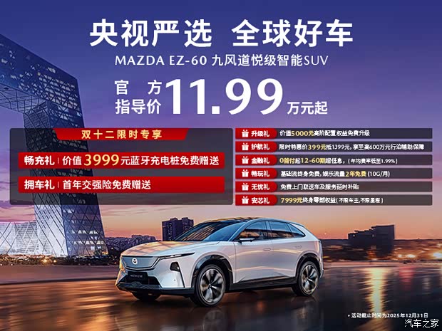 即日起至2025年12月31日,下订购买长安马自达EZ-60车型,还可享八大购车权益!
