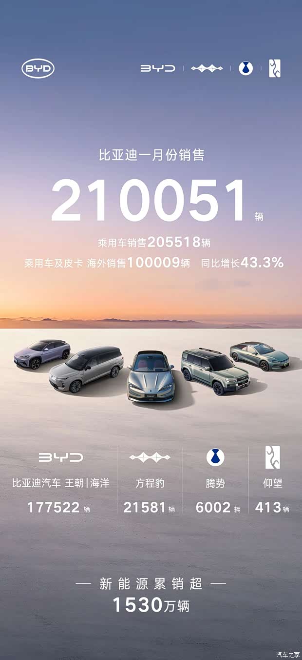 比亚迪1月份销售210051辆,获得中国新能源汽车销冠