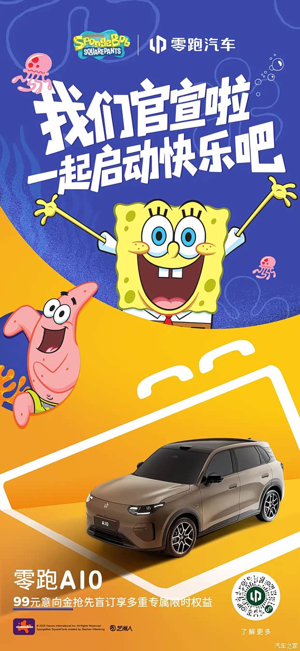 谁的童年DNA动了??! 零跑A10 | 海绵宝宝联名,萌力全开 你准备好与海绵宝宝和比奇堡居民们 一起进入比奇堡的快乐世界了吗? 🚗快上车,快乐要加速了! 马年放开跑 快乐显眼包 零跑A10 | 海绵宝宝和他的朋友们 与你一起共度有趣马年
