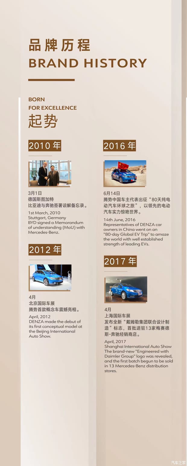 腾势汽车是由中国新能源汽车领军企业比亚迪与世界豪华车制造巨头德国梅赛德斯-奔驰共同设立的合资企业,成立于2010年,总部位于深圳市,是中国首个致力于新能源的汽车合资品牌。