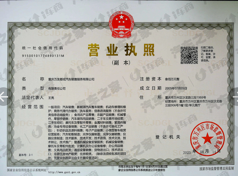 重庆万友都成汽车销售服务有限公司是由万友汽车投资有限公司和重庆都成实业发展有限公司共同投资组建成立。公司成立于2005年,目前在万州地区拥有长安汽车、长安欧尚汽车、长安凯程汽车3家4S店,是集汽车销售、售后服务、配件供应、信息反馈及汽车装饰美容等为一体的综合性汽车销售服务企业。公司现有员工100余人,营业面积达6000多方米。年汽车销售2000多辆,是万州地区最有影响力的汽车经销商之一。