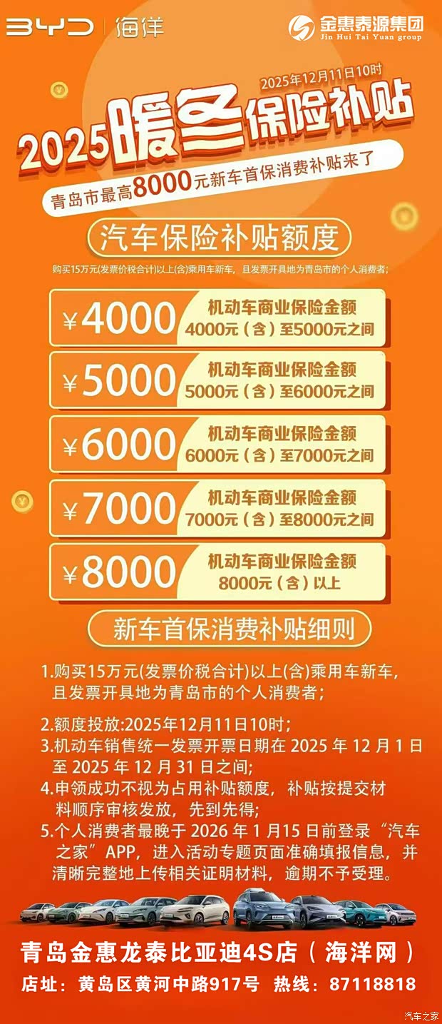 青岛国补省补重启+新车保险补贴至高可享8000元,综合补贴至高28000元