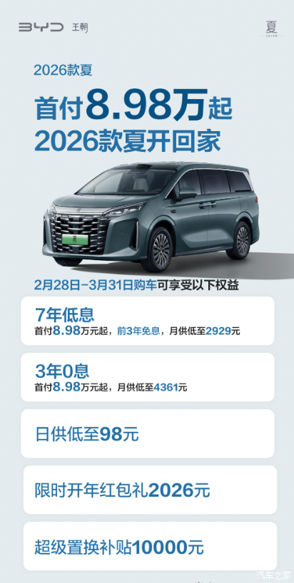 #家庭头等舱2026款夏 # 开春购车福利重磅来袭!金融礼遇升级加码,即日起至3月31日购车,限时可享7年低息或3年0息! 首付仅需8.98万起,日供低至98元!除了超级置换补贴10000元外,还可叠加2026元开年红包礼!入手门槛低,购车无压力,头等舱出行体验,即刻入手,全家畅享!