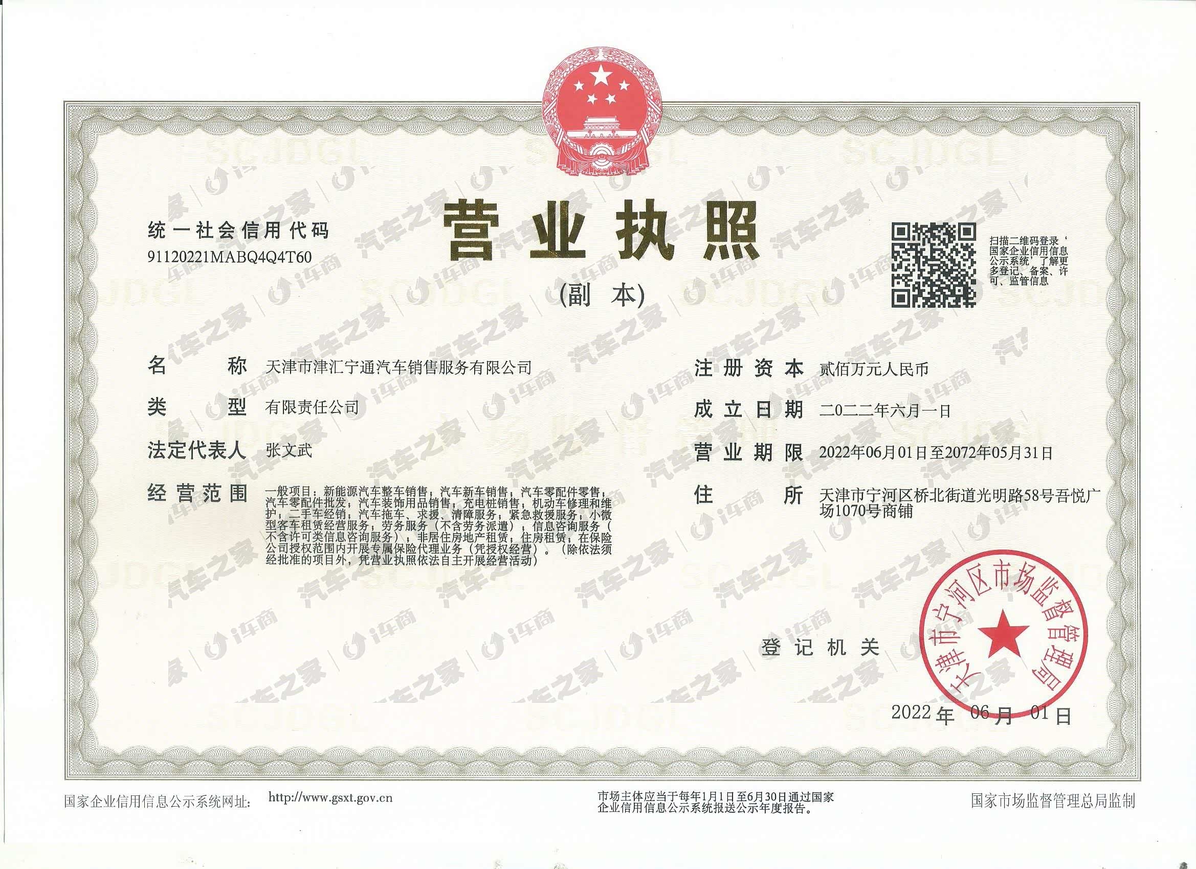 天津市津汇宁通汽车销售服务有限公司成立于2022年6月1日,地址在天津市宁河区桥北街道光明路58号吾悦广场1070号商铺,法定代表人为张文武。经营范围包括一般项目:汽车新车销售;新能源汽车整车销售;汽车零配件销售;汽车零配件批发;汽车装饰用品销售;充电桩销售;二手车经销;小微型客车租赁经营服务;机动车修理和维护;汽车拖车、救援、清障服务;紧急救援服务;劳务服务(不含劳务派遣);在保险公司授权范围内开展专属保险代理业务(凭授权经营);信息咨询服务(不含许可类信息咨询服务);非居住房地产租赁;住房租赁。(除依法须经批准的项目外,凭营业执照依法自主开展经营活动)。