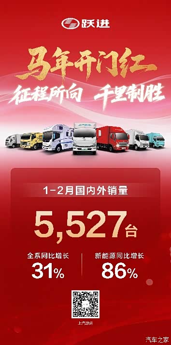 “黑马”跃进稳步推进新能源化,布局绿色智慧电卡新生态。跃进1-2月整体热销5,527辆,同比增长31%,其中新能源车型销量同比大增86%,1月更在新能源轻卡市场市占率登顶,成为绿色城配物流信赖之选。跃进同步深化生态布局,与多家高新技术企业深度对接,围绕电卡新生态探索合作路径,为新能源商用车的场景化落地与市场拓展奠定基础。