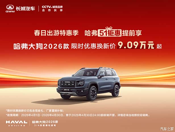 3/4刻度潮玩座驾,哈弗大狗2026款现已焕新上市,潮流方盒子造型更加个性时尚;升级新一代Coffee OS 智能座舱,应用生态更丰富,语音响应更速度;14.6英寸智慧中控屏清晰度更高、操控更流畅;高配车型搭载2.0T+9DCT动力组合,8种驾驶模式,智能电控四驱系统,“2”把锁等配置,越野性能再突破,全场景自由行!现在购车,享限时优惠价9.89万元起,另享厂家置换补贴至高8000元及国补/地补至高15000元等多重壕礼。
