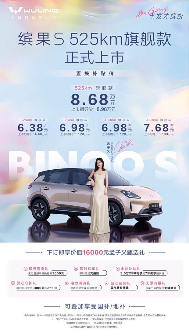 Be Going,出发才缤纷 五菱缤果S 525km旗舰款,正式登场! 长续航解锁更远的风景,高颜值适配每一种生活 8.68万起的诚意价格,搭配16000元专属宠粉礼 从通勤代步到周末自驾,承包你所有出行的浪漫 和孟子义一起,开着缤果S,奔赴每一场热爱!