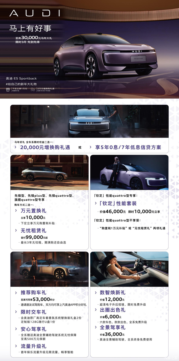 新年的仪式感,从拥有一台心仪的座驾开始。上汽奥迪「马上有好事」新春购车季正式开启,奥迪 E5 Sportback 携至高 30,000 元马年大礼而来,限时 3 月,先到先得,让你把科技与惊喜一并带回家。