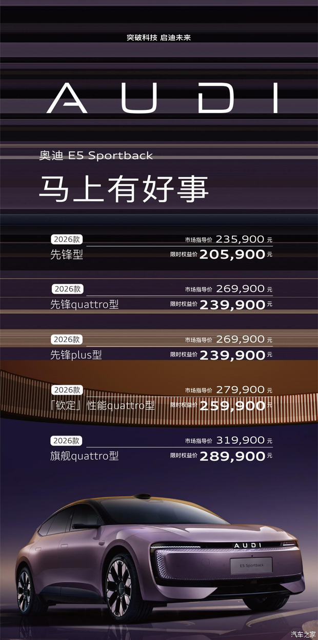 2026 款奥迪 E5 Sportback 五大配置版本,均以极具诚意的限时权益价登场: