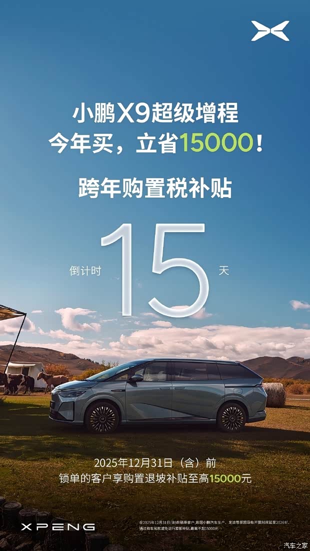 跨年购置税补贴倒计时15天,2025年12月31日(含)前锁单,即可享购置退坡补贴至高15000元。