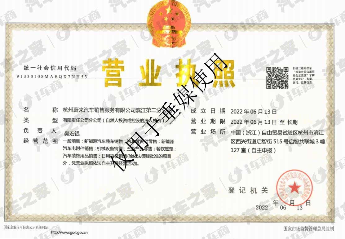 杭州蔚来汽车销售服务有限公司滨江第二分公司