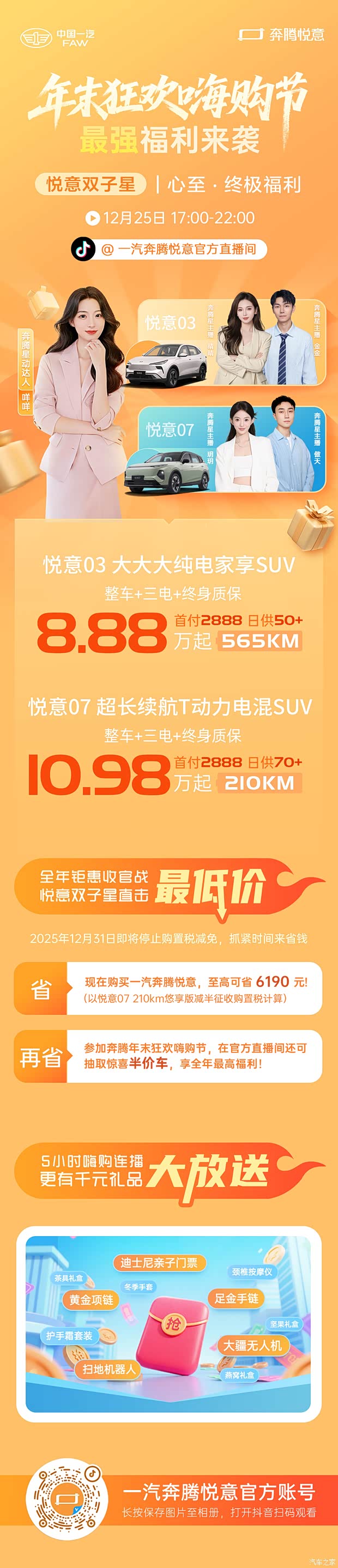 2025年购置税倒计时还剩7天!奔腾年末狂欢嗨购节1天!12月25日17:00 - 22:00,锁定一汽奔腾官方直播间!抽千元精美礼品,抢悦意双子星,福利惊喜,直播间等你!#奔腾悦意03 #奔腾悦意07