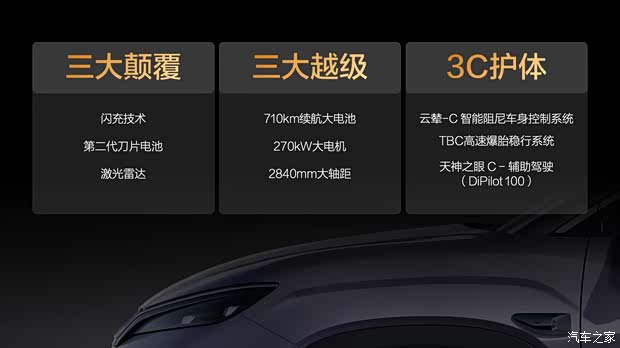 除了“第二代刀片电池、闪充技术及激光雷达”带来的三大颠覆,宋还带来了“三大越级、3C 护体”。宋的电机最大功率为270kW,为多种场景尤其是高速行驶带来了充沛的动力,其最高时速可达210km/h。