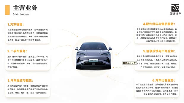 “专业、专注”是亚通汽车集团的生存与发展之本。作为比亚迪汽车在金华、绍兴、衢州、温州、宁波、丽水等地区的授权经销商,集团始终秉持“客户是我们的家人,是永恒的伙伴”的服务理念,为客户提供统一标准的售前、售后服务,致力于实现最高的客户满意度。集团凭借专业的服务团队、先进的硬件设施和科学规范的管理机制,赢得了市场的广泛认可和消费者的信赖“专业、专注”是亚通汽车集团的生存与发展之本。作为比亚迪汽车在金华、绍兴、衢州、温州、宁波、丽水等地区的授权经销商,集团始终秉持“客户是我们的家人,是永恒的伙伴”的服务理念,为客户提供统一标准的售前、售后服务,致力于实现最高的客户满意度。集团凭借专业的服务团队、先进的硬件设施和科学规范的管理机制,赢得了市场的广泛认可和消费者的信赖.
