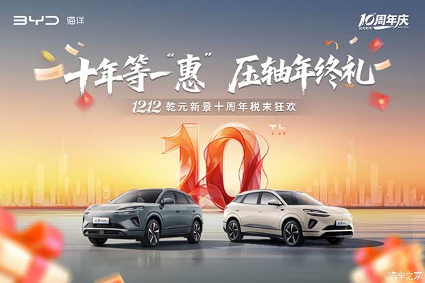 在时光的长河中,十年是一段足以沉淀经典、见证辉煌的岁月。当乾元新景十周年,再与双十二这个购物狂欢节点激情碰撞,一场前所未有的年终购车盛宴正火热开启!12 月 6 日至 14 日,比亚迪乾元新景“十年等一‘惠’,压轴年终礼——1212 乾元新景十周年税末狂欢”活动震撼登场,错过这次,你可能要再等十年!
