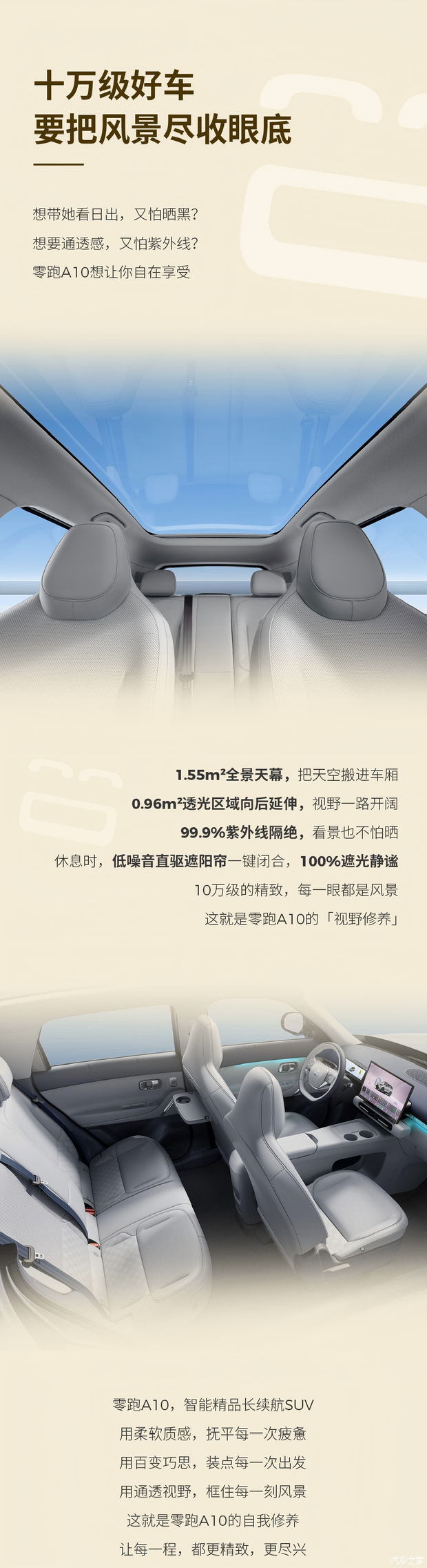 零跑A10,智能精品长续航SUV格局灵活,包容生活的每一种热爱细致周到,让每一段旅途都更加舒适这就是零跑A10的自我修养让每一次出发和归途,都更从容、更安心