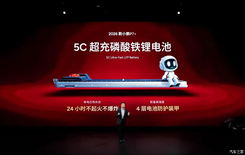 安全,是2026款小鹏P7+的核心基石。新车同步满足中国与欧洲双五星安全标准,树立智能电动轿车的安全新标杆。其搭载的5C超充磷酸铁锂电池,在热失控后可实现24小时不起火,安全性远超即将实施的2026年电池新国标要求;车身结构方面,采用大吨位16000吨压铸机打造的量产最大一体式压铸后地板,并全系标配2000兆帕超高强度笼式车身,可承受高达800kN的冲击力,构筑起一座“移动的五星安全堡垒”。此外,P7+行业首发冰雪场景AES主动安全系统,精准应对复杂低温路况,为用户在各种出行环境中提供全方位、全天候的安全守护。
