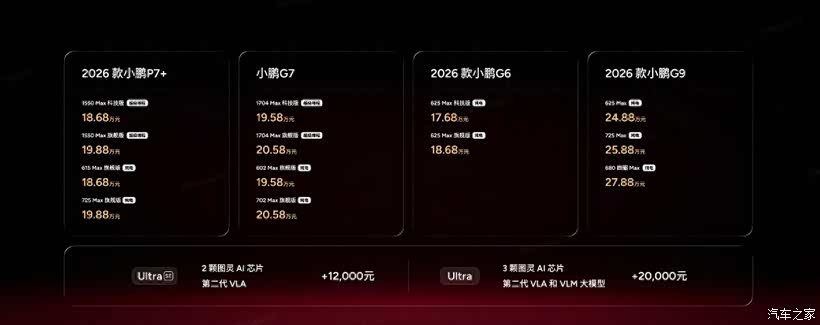 【2026年1月8日,广州】 今日,在2026小鹏全球新品发布会上,小鹏汽车正式发布2026 款小鹏 P7+、小鹏 G7 超级增程、2026 款小鹏 G6、2026 款小鹏 G9。其中2026款小鹏P7+ 全球36国同步发布,新车有超级增程和纯电两种能源形式,超级增程有1550 Max 科技版和1550 Max 旗舰版,官方指导售价为18.68万元和19.88万元;纯电有615 Max旗舰版和725 Max 旗舰版,官方指导售价为18.68万元和19.88万元。2026款小鹏G7推出四个版本,超级增程1704 Max 科技版和1704 Max 旗舰版,官方指导售价为19.58万元和20.58万元;纯电602 Max 旗舰版和702 Max 旗舰版,官方指导售价为19.58万元和20.58万元。2026 款小鹏 G6推出纯电625 Max 科技版和625 Max 旗舰版,官方指导售价为17.68万元和18.68万元。2026 款小鹏 G9推出纯电625Max、725 Max和680 四驱Max版,官方指导售价为24.88万元、25.88万元和27.88万元。