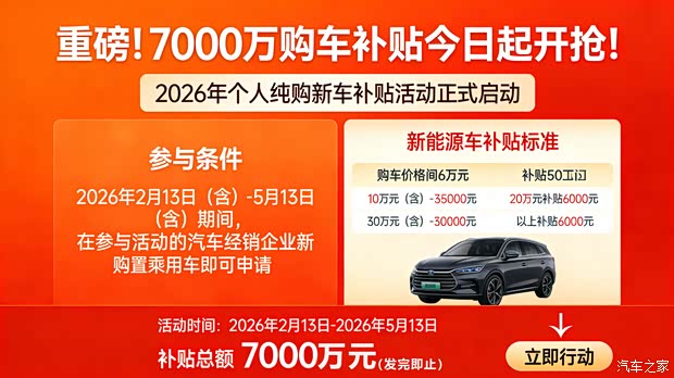 想买新车的朋友们注意了!2026年个人纯购新车补贴活动今日正式启动,总补贴资金高达7000万元,先到先得,手慢无!