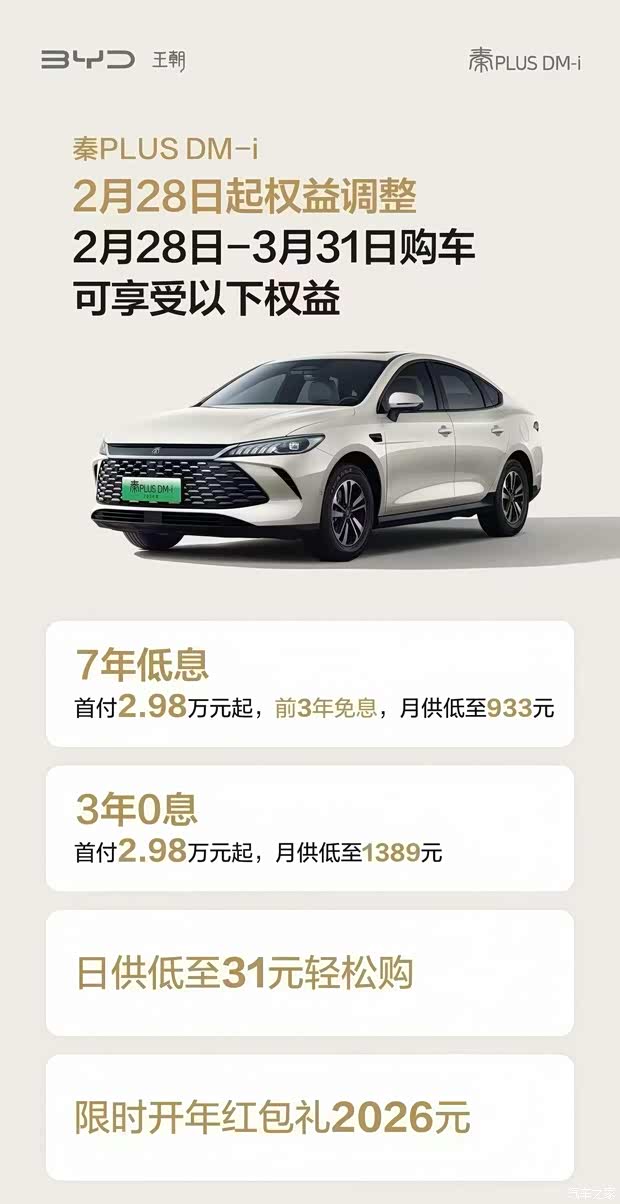 秦PLUS DM-i首付2.98万元起,日供低至31元 还有2026元开年红包礼 7年低息、3年0息,开年轻松购