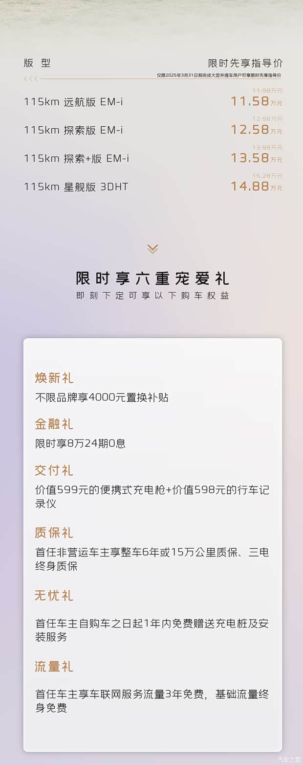 首任非营运车主享整车6年或15万公里质保、三电终身质保