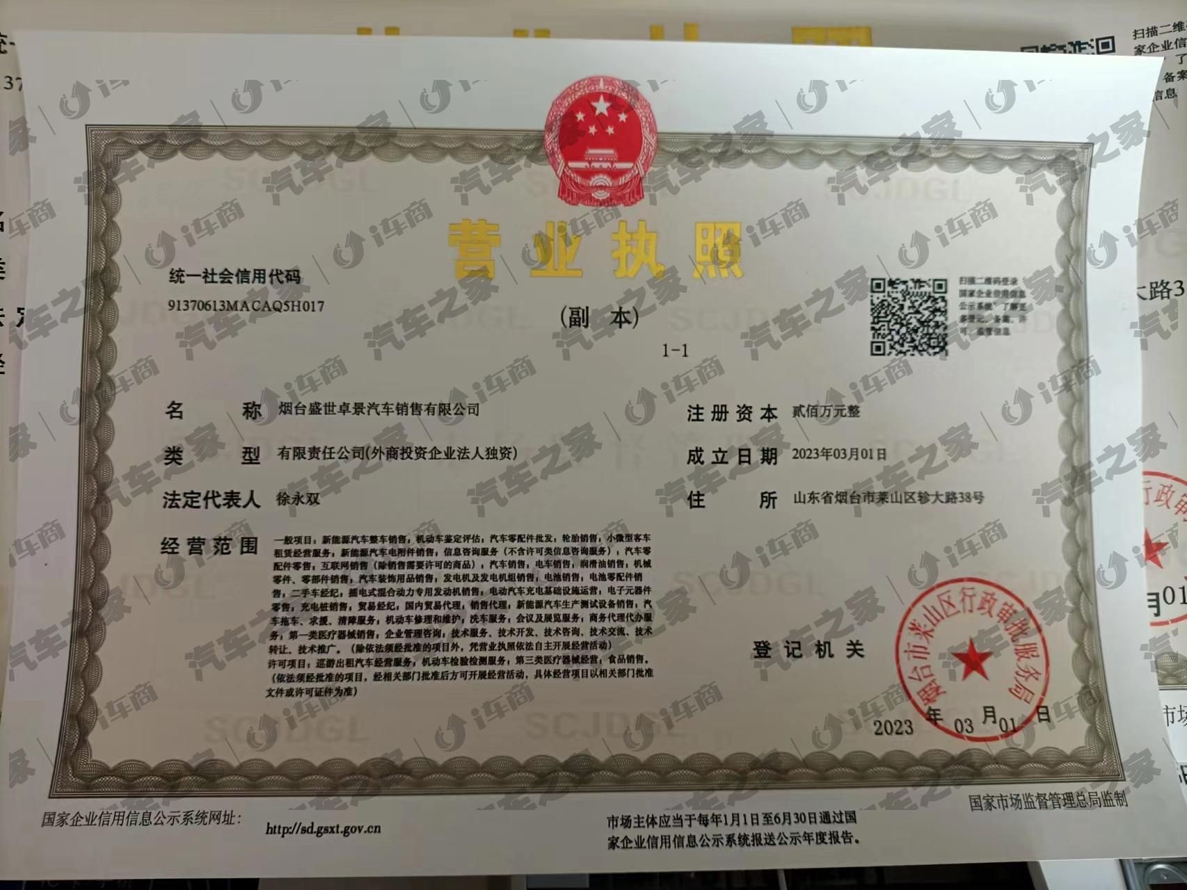 - 烟台盛世卓景汽车销售有限公司成立于2023年03月01日,注册地位于山东省烟台市莱山区轸大路38号。公司属于比亚迪海洋网一级4S店,展厅建筑面积600余平方米,售后建筑面积2000余平方米,致力于为客户提供最好的销售以及售后服务体验。