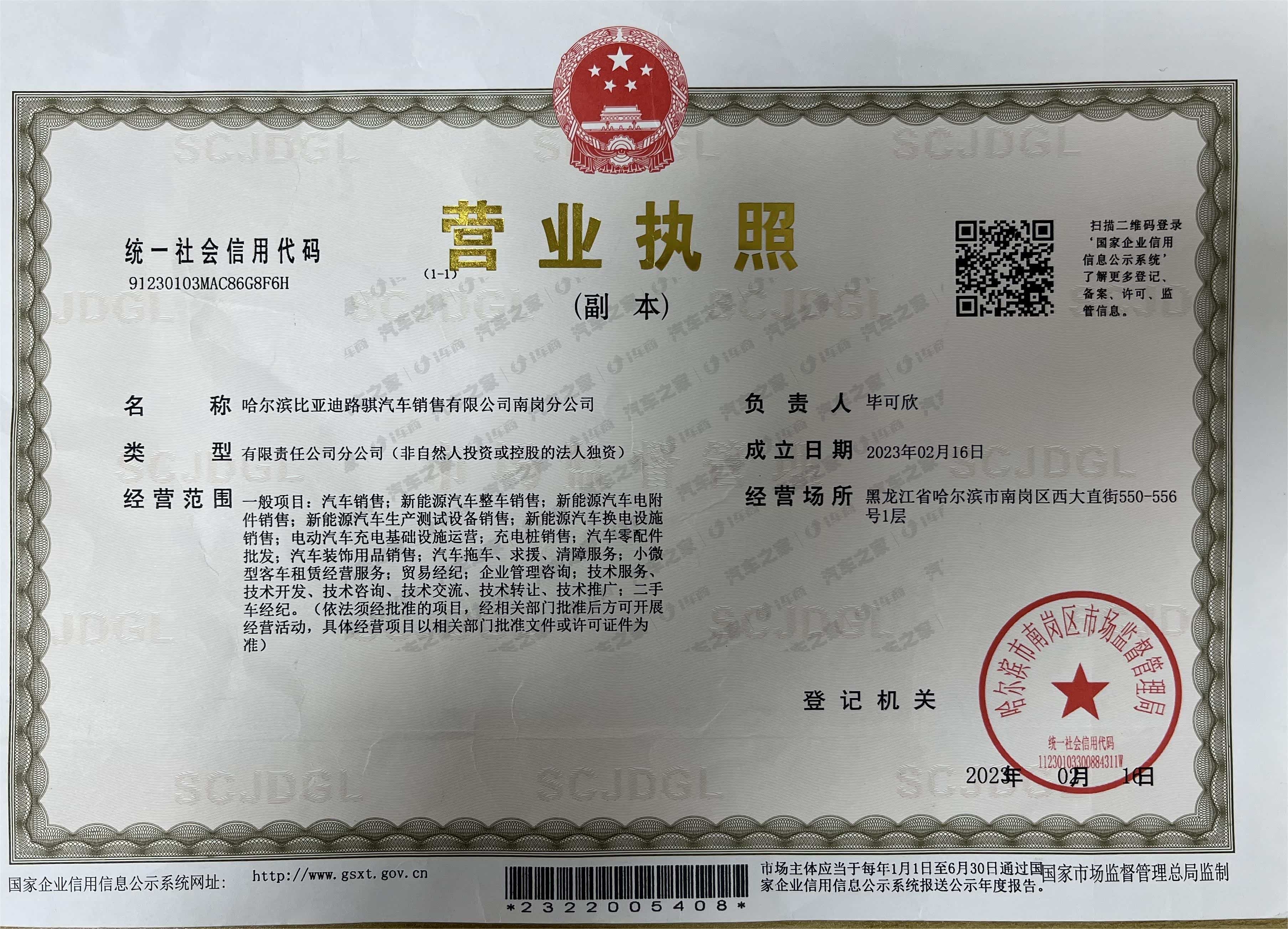 哈尔滨比亚迪路骐西大直街城市展厅,隶属于比亚迪乾元新景集团,位于哈尔滨市南岗区西大直街550-556号,位于哈尔滨市中心位置,临近地铁1号线,交通便利。主要业务为比亚迪全系汽车销售、汽车金融按揭、配件销售、汽车精品销售、二手车置换、管理咨询等项目,同时为客户提供车型询价、试乘试驾、新车保险、上牌等服务,以过硬的品质、热忱的服务,致力于为客户提供高性价比的汽车产品,打造满意的售前和完善的售后服务体系,为客户提供精于勤、诚于心的购车和用车服务。