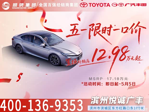 顺骋丰田滨州悦诚东方红店为您量身定制购车方案,让您省心省力更省钱!