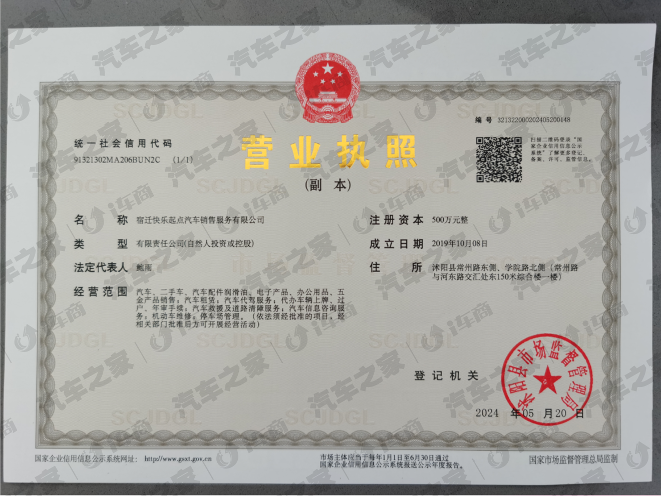 宿迁快乐起点汽车销售服务有限公司办公室地址位于虞姬的故乡沭阳,宿迁市沭阳县万达广场3#楼集中商业、公寓A栋、B栋、C栋幢B栋1724室,于2019年10月08日在宿迁市沭阳县市场监督管理局注册成立,注册资本为500万元人民币,在公司发展壮大的3年里,我们始终为客户提供、好的产品和技术支持、健全的售后服务,我公司主要经营汽车、二手车、汽车配件润滑油、电子产品、办公用品、五金产品销售、汽车租赁、汽车代驾服务;代办汽车上牌、过户、年审手续、汽车救援及道路清障服务、汽车信息咨询服务、机动车维修;停车场管理。(依法须经批准的项目,经相关部门批准后方可开展经营活动)。我们有优秀的产品和专业的销售和技术团队,竭诚为您服务。如果您对我公司的产品服务有兴趣,期待您在线留言或者来电咨询!