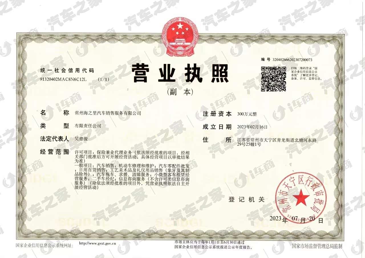 常州海之里汽车销售服务有限公司成立于2023年,注册地位于江苏省常州市天宁区青龙街道北塘河东路29号25幢1号,法定代表人为吴德俊。经营范围包括许可项目:保险兼业代理业务(依法须经批准的项目,经相关部门批准后方可开展经营活动,具体经营项目以审批结果为准) 一般项目:机动车修理和维护;汽车新车销售;汽车零配件零售;日用百货销售;工艺美术品及礼仪用品销售(象牙及其制品除外);汽车拖车、求援、清障服务;小微型客车租赁经营服务;二手车经销;信息咨询服务(不含许可类信息咨询服务)(除依法须经批准的项目外,凭营业执照依法自主开展经营活动)