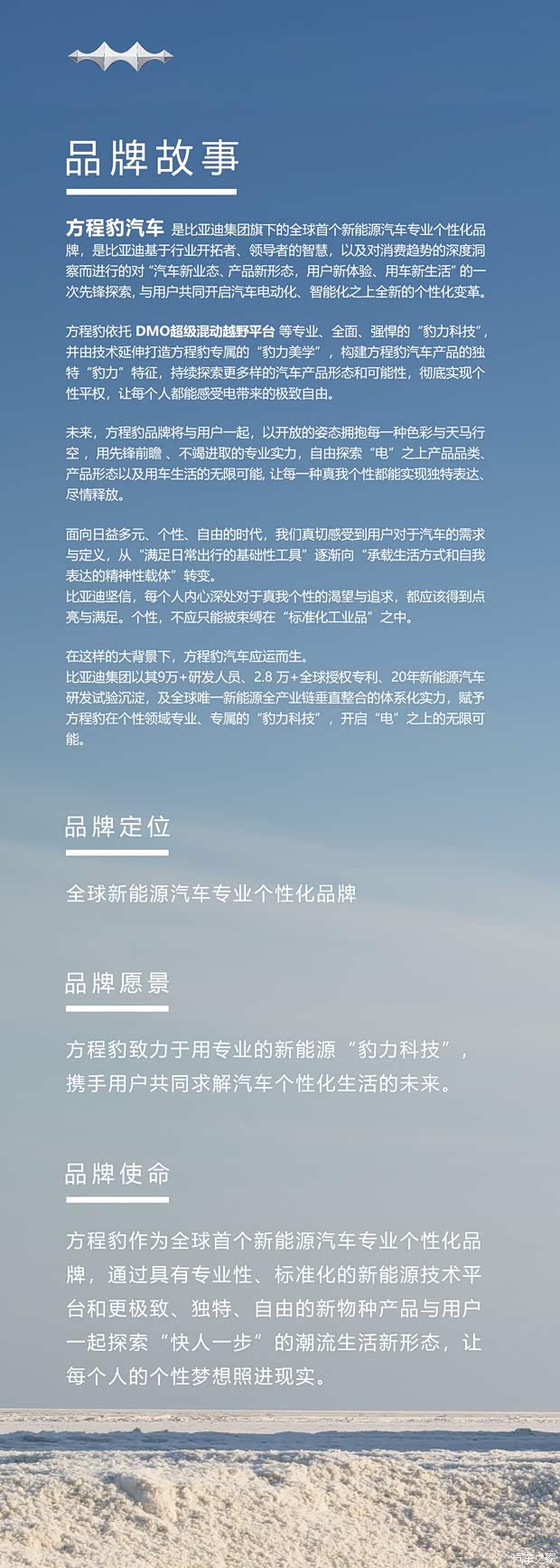 方程豹汽车是比亚迪集团旗下的全球首个新能源汽车专业个性化品牌,是比亚迪基于行业开拓者、领导者的智慧,以及对消费趋势的深度洞察而进行的对“汽车新业态、产品新形态,用户新体验、用车新生活”的一次先锋探索,与用户共同开启汽车电动化、智能化之上全新的个性化变革。
