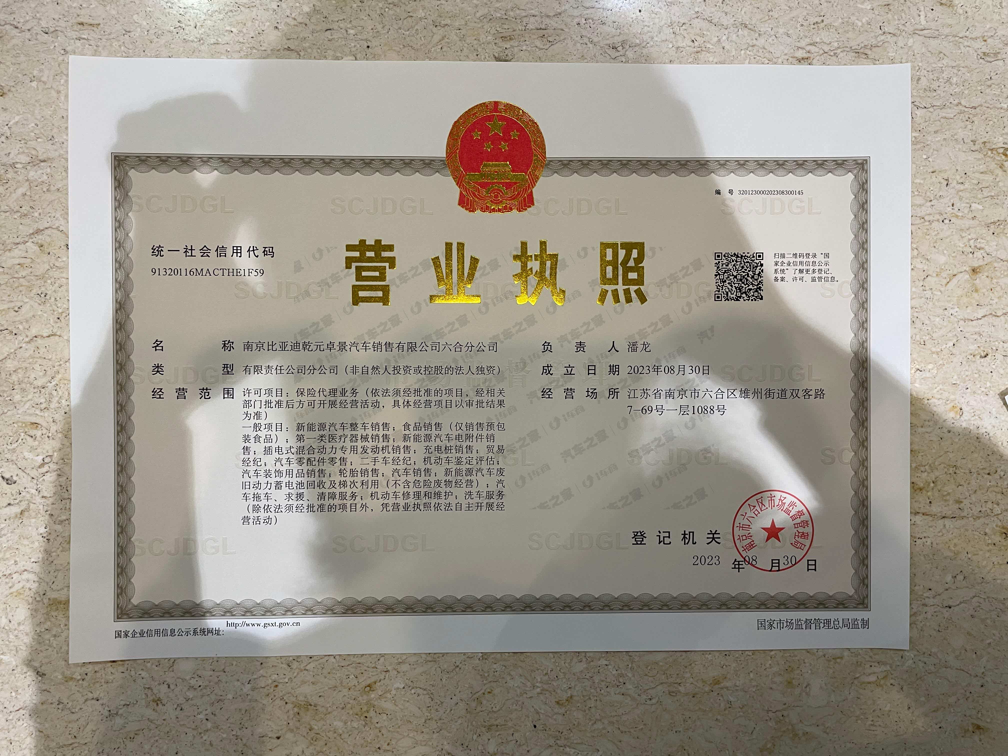 2023年8月30日,南京比亚迪乾元卓景汽车销售有限公司六合分公司成立。经营范围包括新能源汽车整车销售、汽车零配件批发、充电桩销售、二手车经纪、二手车鉴定评估等。
