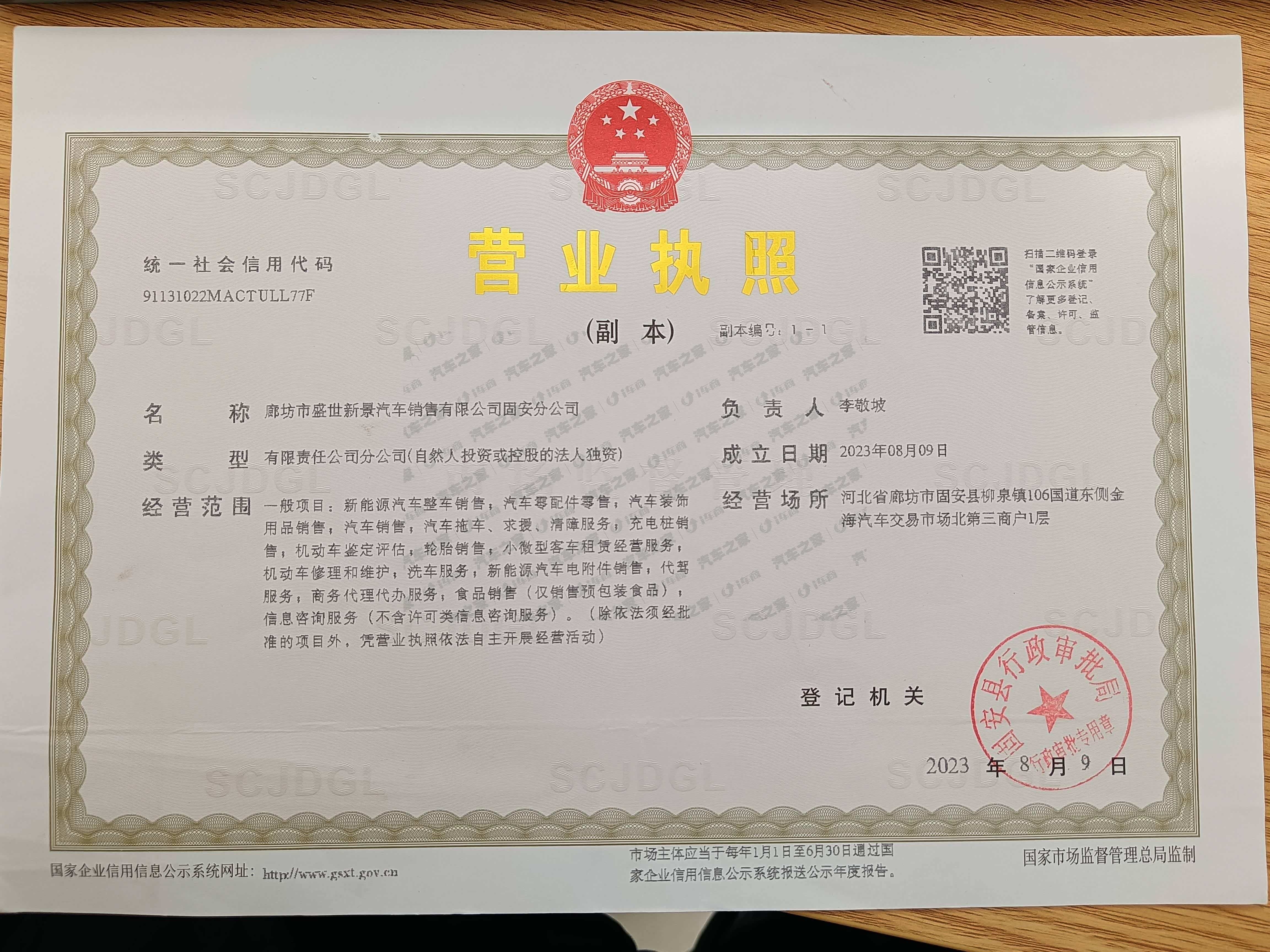 廊坊市盛世新景汽车销售有限公司固安分公司成立于2023年08月09日,注册地位于河北省廊坊市固安县柳泉镇106国道东侧金海汽车交易市场北第三商户1层。经营范围包括一般项目:新能源汽车整车销售;汽车零配件零售;汽车装饰用品销售;汽车销售;汽车拖车、求援、清障服务;充电桩销售;机动车鉴定评估;小微型客车租赁经营服务;机动车修理和维护;新能源汽车电附件销售;商务代理代办服务;信息咨询服务(不含许可类信息咨询服务)。