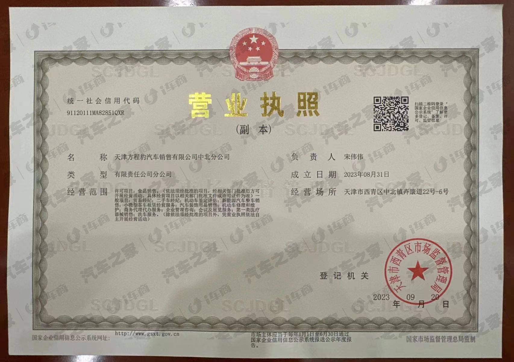 天津方程豹汽车销售有限公司中北分公司