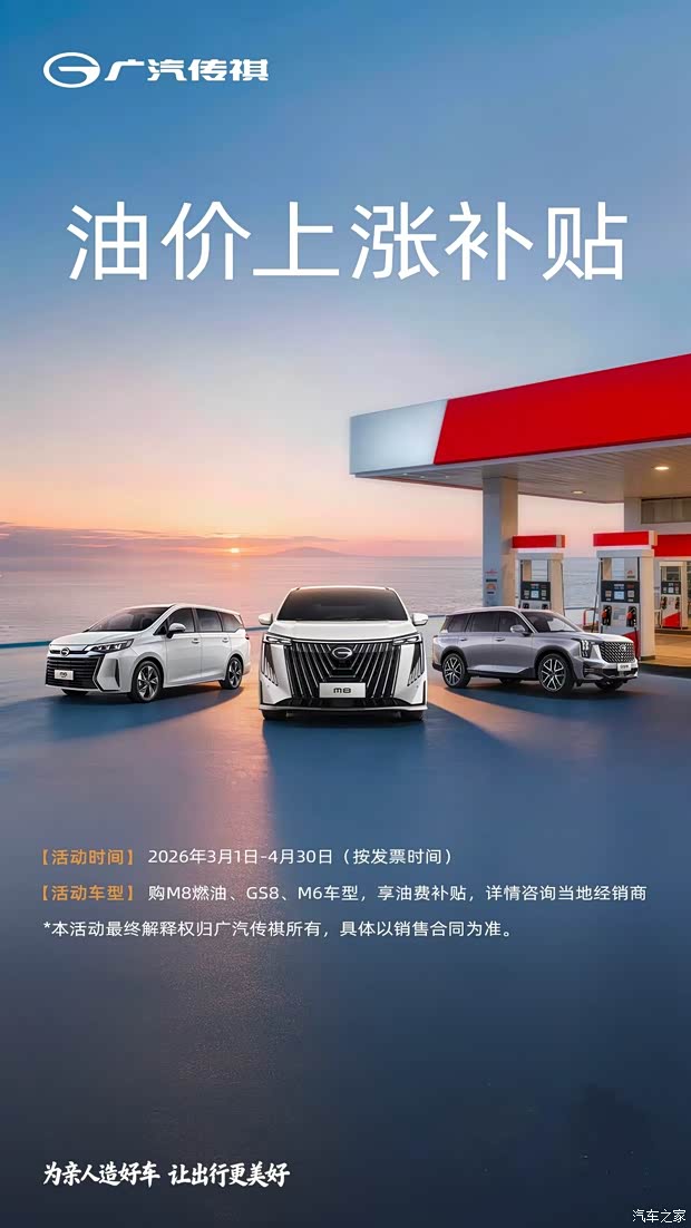 【广汽传祺西安长鼎店】车源保证,诚信有佳,服务更佳! 【广汽传祺 油价上涨补贴】 【活动时间】2026年3月1日-4月30日(按发票时间) 【活动车型】购M8燃油、GS8、M6车型,享油费补贴,详情请咨询店内销售 本活动最终解释权归广汽传祺所有,具体以销售合同为准 地址:陕西省西安市高新区南三环辅道G22号(丈八五路与锦业二路交汇处)