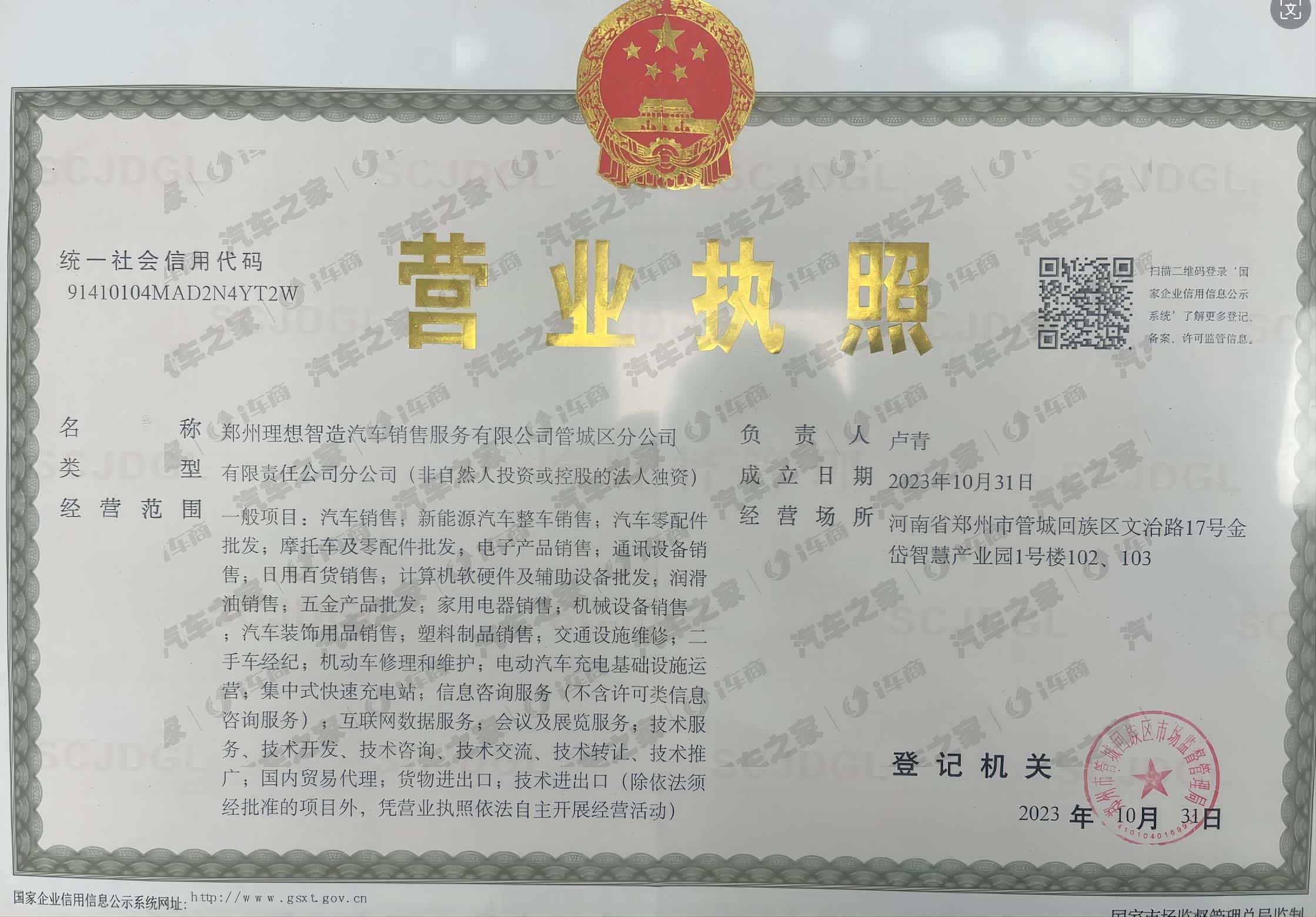 郑州理想智造汽车销售服务有限公司管城区分公司