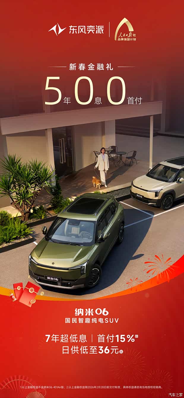 除以上车型,购买纳米01的用户,也可享4000元购置税补贴、5年0首付0利息新春金融礼等福利。从政企联动的消费补贴,到真金白银的厂家让利,再到触手可及的金融方案,东风奕派始终以用户为中心,让每一份对美好出行的期待都能轻松落地。新春福利诚意拉满,购车时机恰逢其时。趁着新春好时节,快将心仪爱车与新春好运一同带回家,开启不“奕”样的马年新旅程吧!
