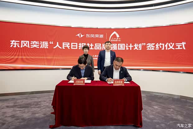 2026年1月11日,东风奕派“人民日报社品牌强国计划”签约仪式在人民日报社举行。人民日报文化传媒有限公司董事长寇非和营销管理部总经理,东风奕派汽车科技公司党委书记、副总经理张俊出席仪式并见证签约。人民日报文化传媒有限公司副总经理郝立鹏与东风奕派营销事业部总经理余岳峰代表双方签署了协议。这一合作,意味着东风奕派正式融入“人民日报社品牌强国计划”大局,肩负起向世界展现中国品牌实力的时代使命。