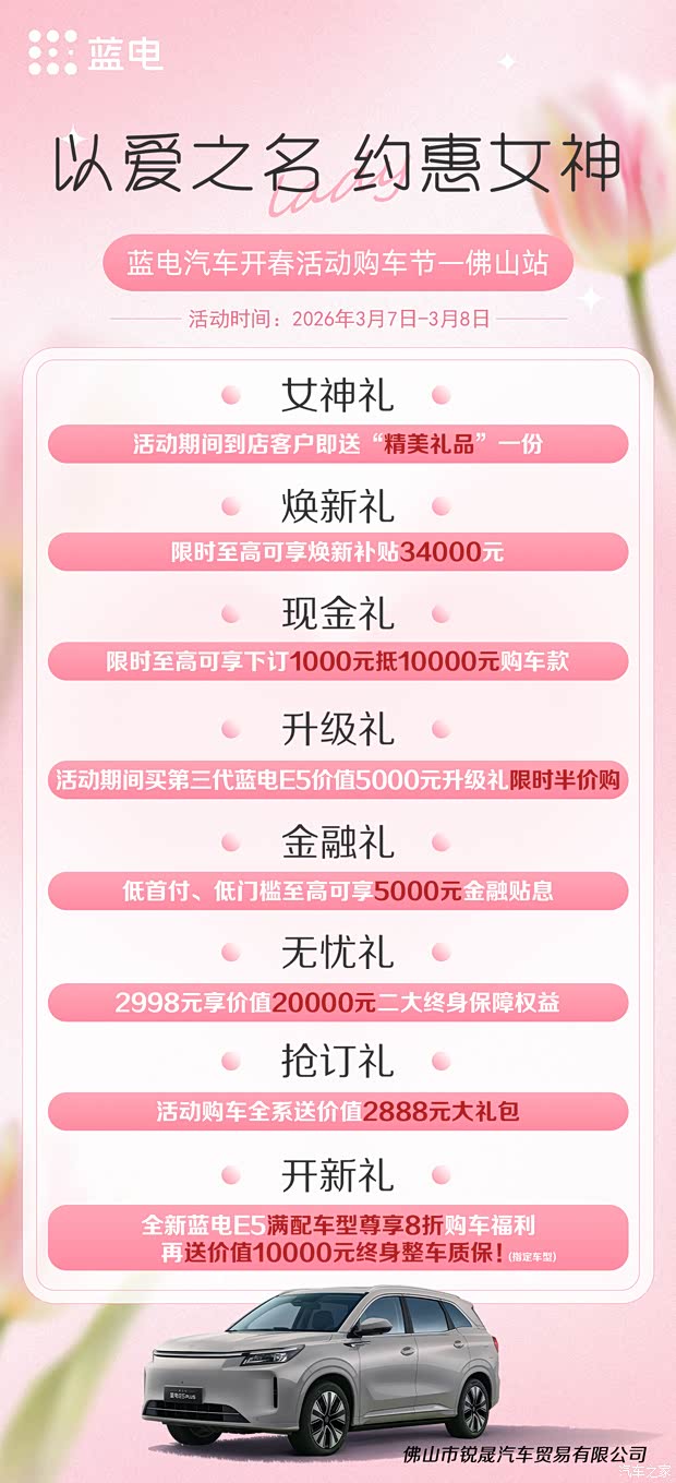 女神节2天闪购!蓝电8重礼击穿底价! ✅到店礼:女神节专属礼品,到店就送! ✅现金礼:1000抵10000,直省9000元! ✅焕新礼:限时至高可焕新补贴3.4万补贴! ✅开新礼:全新蓝电E5满配版8折购车福利+送价值10000元终身质保!(指定车型) ⏰3.7-3.8佛山锐晟,错过再等一年!