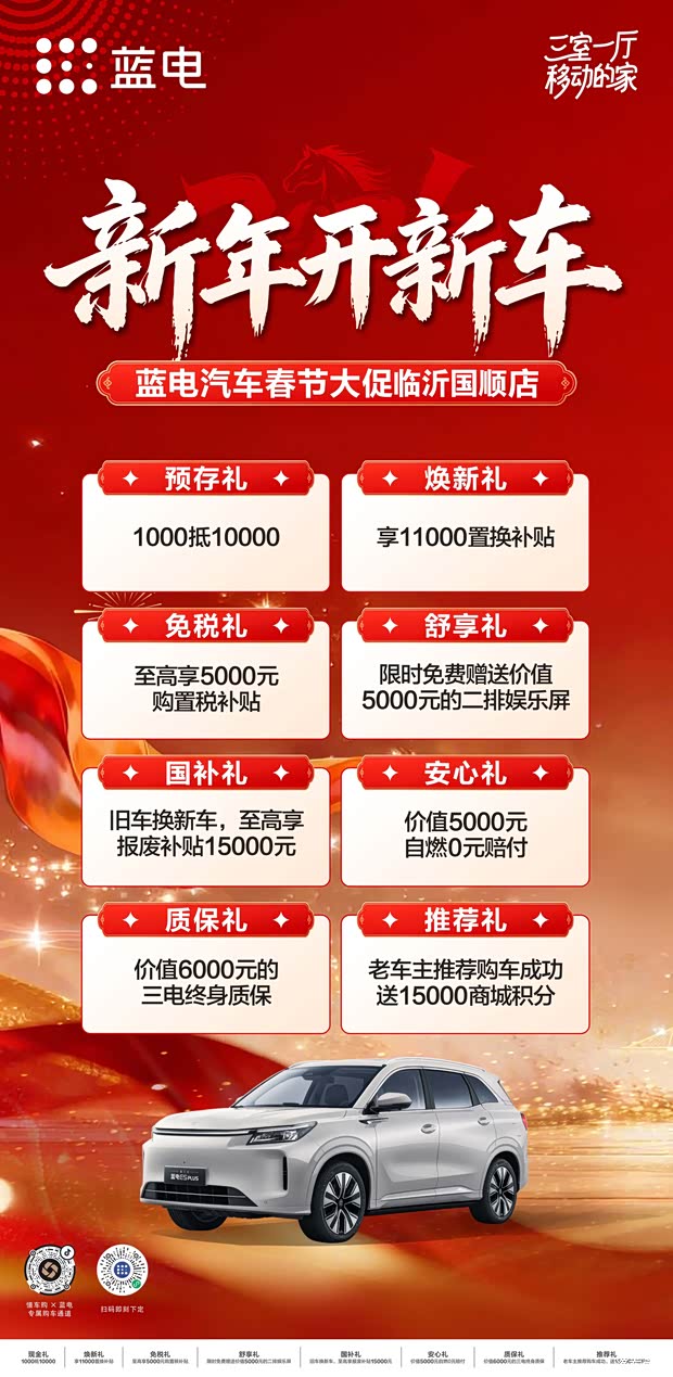 第三代蓝电 E5 PLUS 限时新年福利——3.2 万综合优惠+11.98 万满配价格,再加上三电机四驱、230km 纯电续航、七座大空间等越级配置,这样的福利错过再等一年都未必有,想要买车的朋友千万别犹豫。