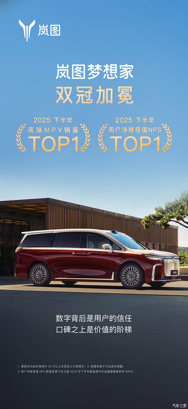 1月6日,杰兰路发布《2025年度下半年新能源汽车品牌健康度研究(NPS篇)》,岚图梦想家以78.5分的净推荐值(NPS)高居新能源MPV榜首,与此同时,岚图梦想家领跑2025年下半年高端MPV市场销量榜,加冕“销量与用户净推荐值”双冠王。