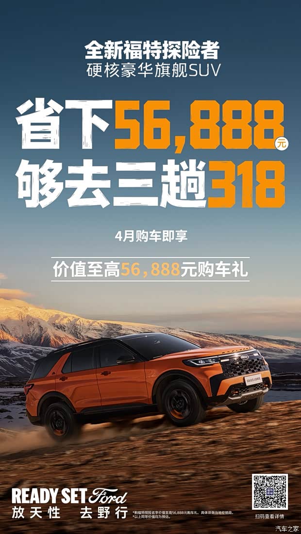 别急,现在就是入手福特探险者的最佳时机!作为公认的“公路之王”,探险者这次不玩虚的,直接甩出一波“王炸”福利:购车即享价值至高56,888元购车礼!省下的这笔真金白银,足够你加满油箱,带着家人去三趟318川藏线,去看看心中的昆仑。