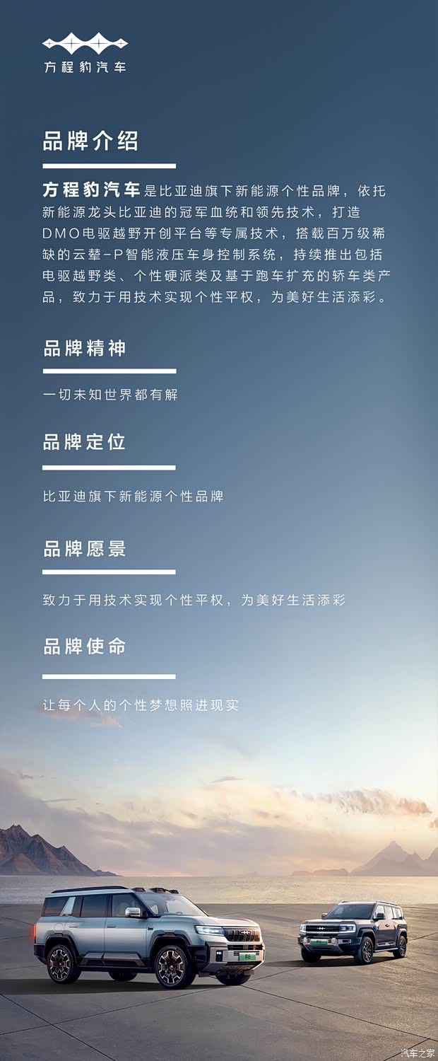 方程豹汽车是比亚迪集团旗下的全球首个新能源汽车专业个性化品牌,是比亚迪基于行业开拓者、领导者的智慧,以及对消费趋势的深度洞察而进行的对“汽车新业态、产品新形态,用户新体验、用车新生活”的一次先锋探索,与用户共同开启汽车电动化、智能化之上全新的个性化变革。