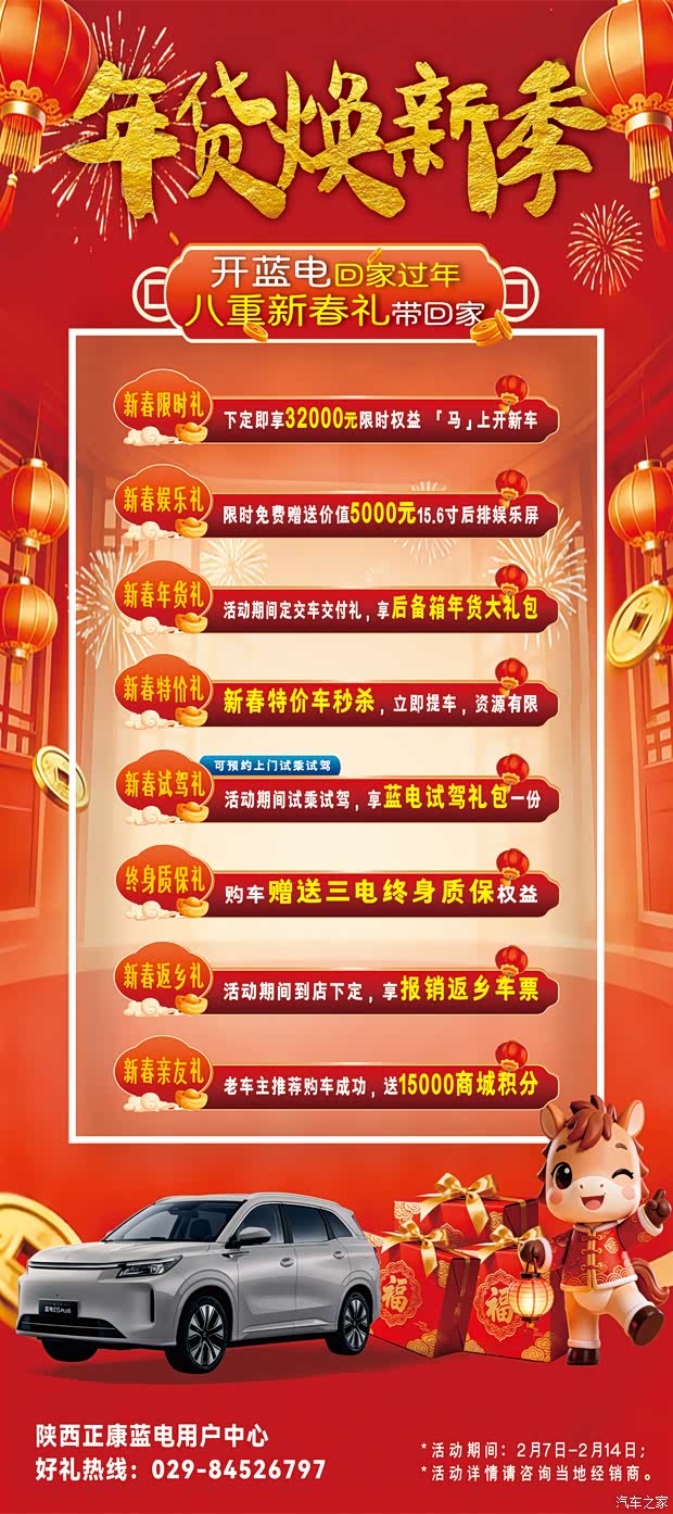 马年春节倒计时,蓝电汽车“年货焕新季”专场活动正式开启!2月7日至14日,到店即享八重新春豪礼,助您轻松开新车回家团圆,过个有车有面有温度的幸福年!八重礼遇详情[新春限时礼】下定即享32000元限时权益「马」上开新车[新春娱乐礼】限时免费赠送价值5000元,15.6寸后排娱乐屏[新春年货礼】活动期间定交交付礼,享后备箱年货大礼包