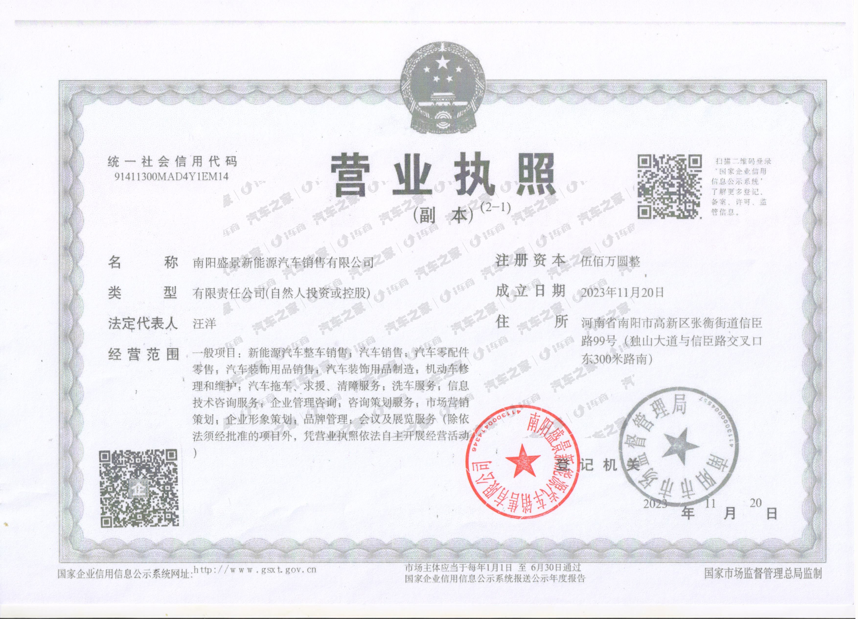 公司简介: 南阳盛景新能源汽车销售有限公司成立于2009年06月30日,注册地位于河南省南阳市宛城区独山大道与信臣路交叉口东300米路南。经营范围包括一般项目:汽车销售;新能源汽车整车销售;汽车零配件批发;汽车零配件零售;汽车装饰用品销售;机动车修理和维护;洗车服务;信息技术咨询服务;信息咨询服务(不含许可类信息咨询服务);会议及展览服务;品牌管理;汽车拖车、求援、清障服务;咨询策划服务(除依法须经批准的项目外,凭营业执照依法自主开展经营活动)。