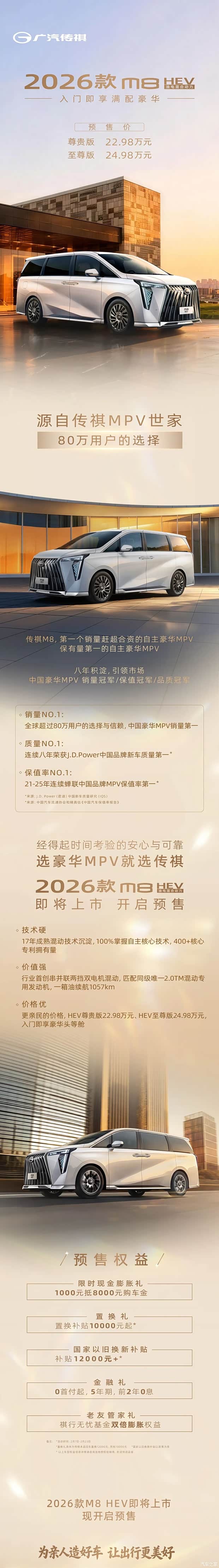 传祺MPV 80多万用户的选择,国产豪华混动MPV创领者 2026款传祺M8 HEV 油电同价 入门即满配 全系标配L2智能驾驶,2.0T混动专用发动机 百公里油耗仅6.15L,1057km的续航 360度矩阵气囊。超感交互智能座舱 别再为‘选油还是选电’摇摆,2026款传祺M8 HEV就是首选