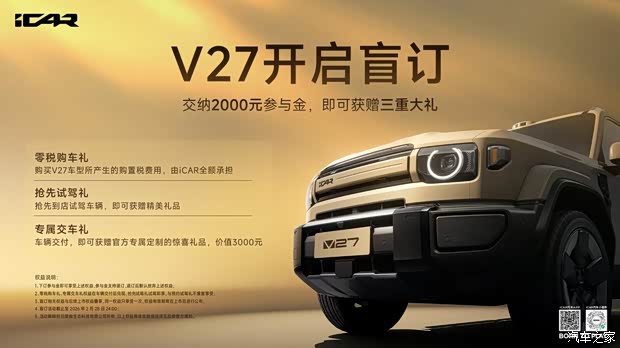 iCAR V27 限时盲订 已全面启动,即日起至2026年2月28日,支付 2000元参与金,您将锁定: